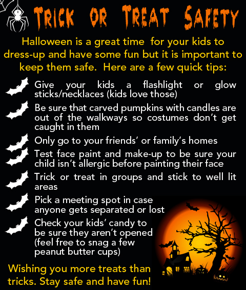 Halloween is a great time for your kids to dress-up and have some fun but it is important to keep them safe. Here are a few quick tips.