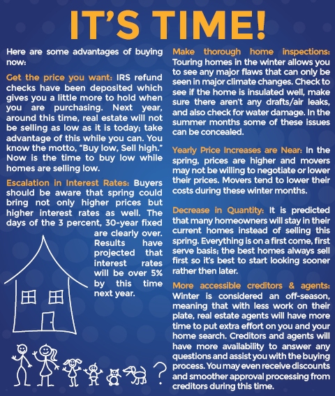 As you look outside, you see more snow falling and you feel the temperature getting colder every day. You’re concerned with cleaning off your car and getting shoveled out; buying a home may not have even crossed your mind. Many argue that spring is the best time to find your dream home, but if you are ready, The Time is Now!