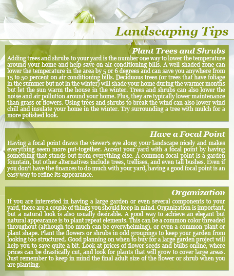 Landscaping can be costly and discouraging if done improperly, but there are several things that you can do to increase the beauty and value of your home for an affordable price. When done correctly, landscaping can even save you on electricity and water bills in the future. Here are a few good guidelines to follow when considering how to landscape your yard.