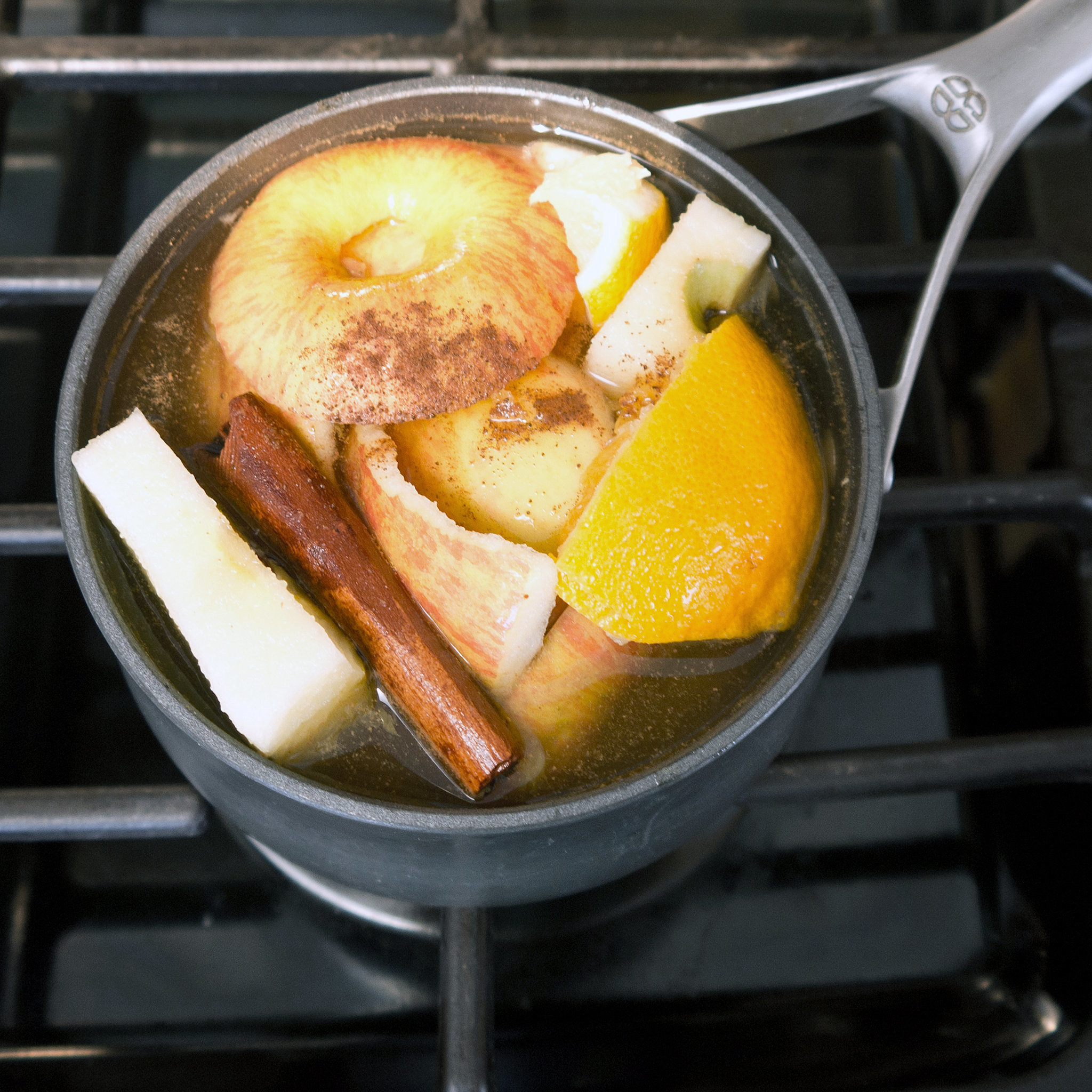 Add all the ingredients to the small saucepan, fill with water, and simmer over low heat. You can keep adding water as needed, which makes this pot-o-happiness smell wonderful all day.