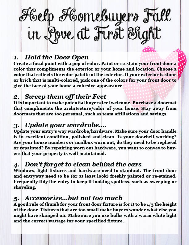 From the very first glance, either online or in person, potential buyers should immediately be hooked and feel like it is already their home. Most homeowners rarely go through their own front entry, so take some time to enter though your front entry and view it as if you were seeing it for the first time. Prospective buyers will notice every detail and determine whether or not they are interested in your property.